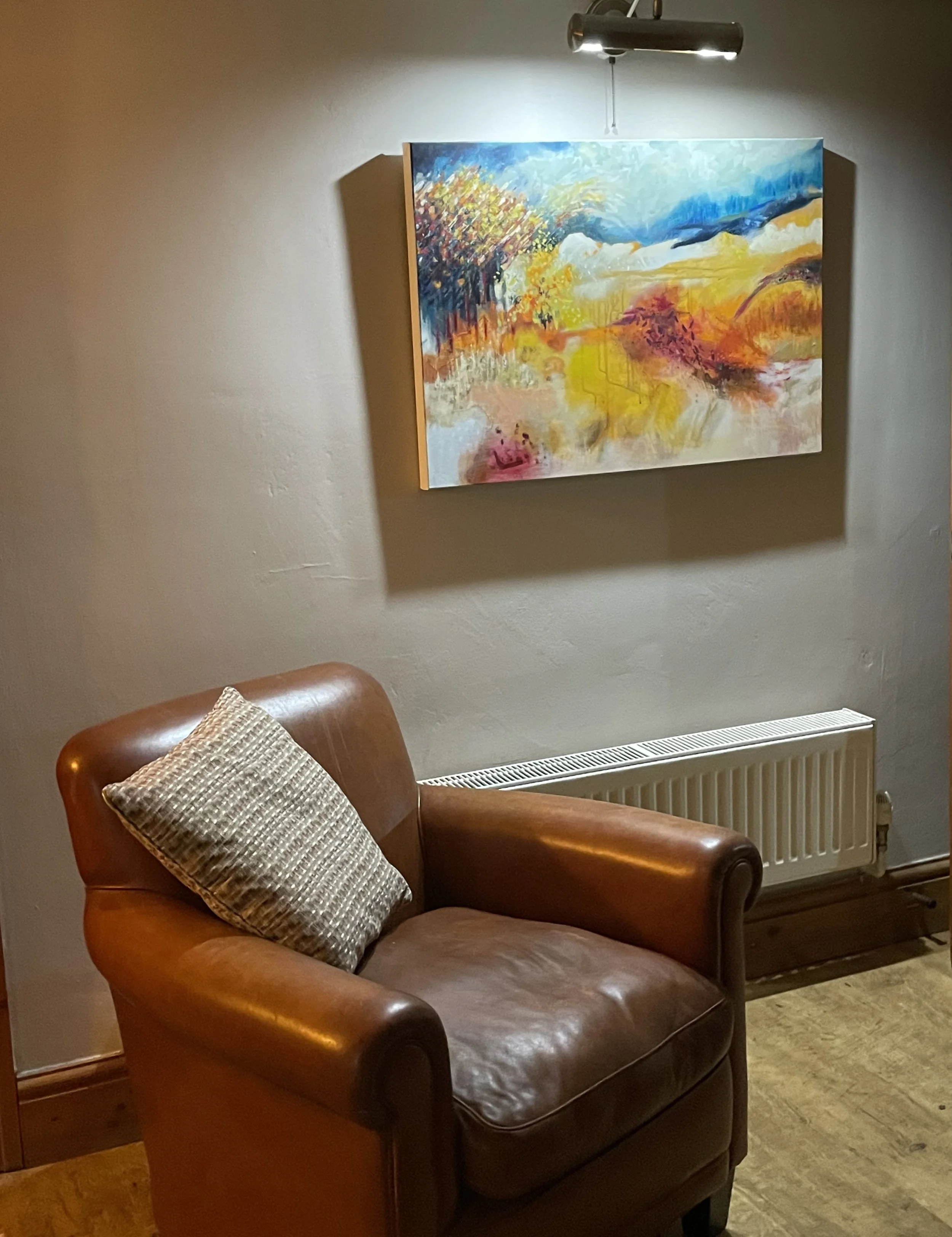 They requested a painting to reflect the relaxed and welcoming atmosphere of the room and the autumnal landscape that surrounded them at the time of their move.